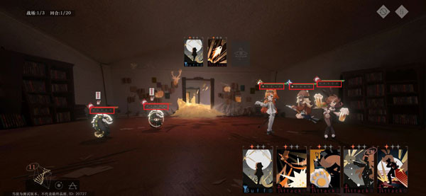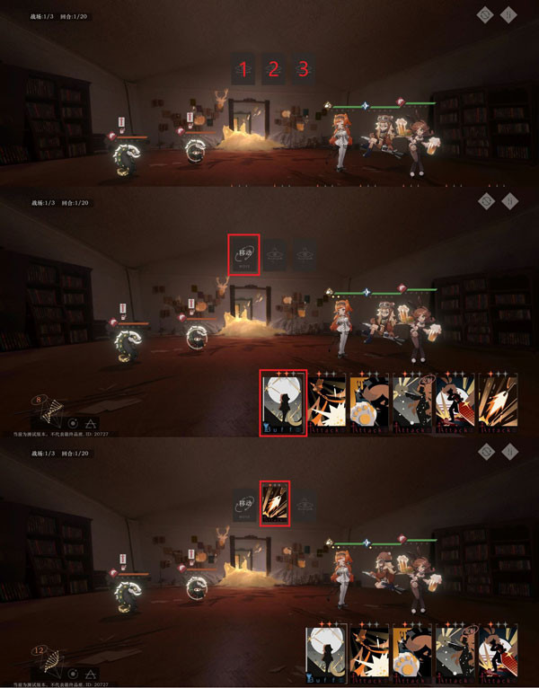 5、每回合的行动次数视在场人数而定。如图所示,我方当前场上有三人。所以本回合我们可以行动三次。每次选择使用或者移动卡牌都需要消耗一点行动点。