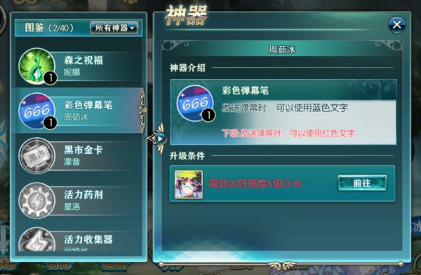 每个角色的神器都有自己与众不同的作用,好感度提升后,神器效果也会进一步提升呢。
