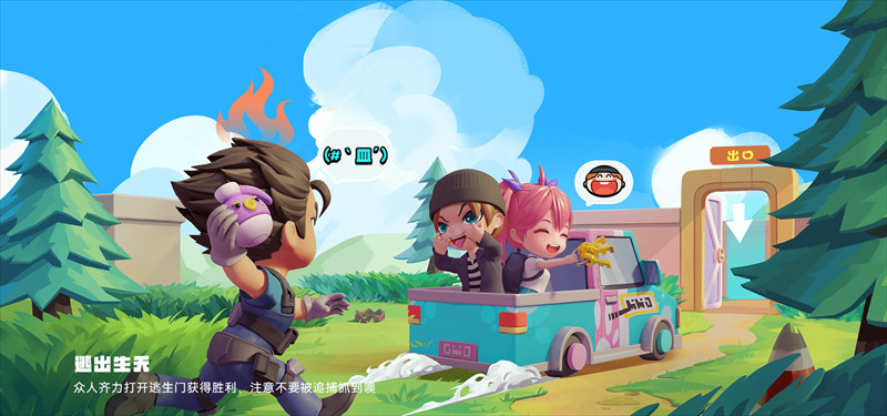 利用各种道具武器卡引开追捕者,让队友顺利开锁