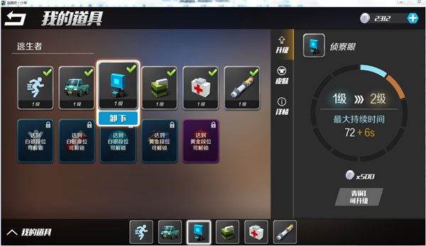 目前到达白银段位可以解锁“跳高”、“生命上限”和“雷达”三张道具卡,黄金段位可以解锁“巡逻犬”和“阻挡箱”两张道具卡。