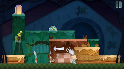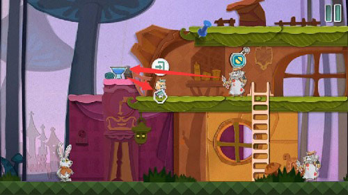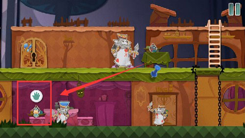 8、将黄色场景向右拖动让变小药水和变大蛋糕重叠在一起,使用钥匙开门后扑克兵会喝下变小药水变成最小。
