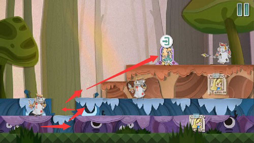 4、回头拉下拉杆,然后将青色方块往右移,用较矮的柱子铺路,移动到对面黄色方块上。