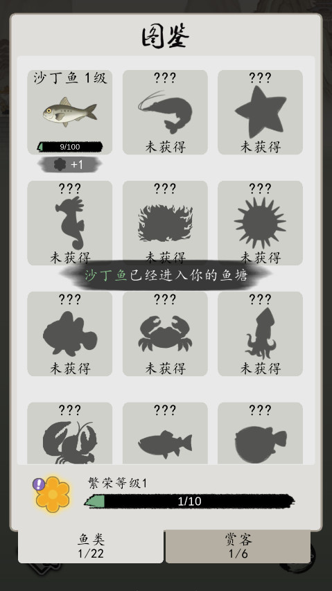 进入图鉴收录各类灵鱼,提升繁荣度可解锁更多种类。
