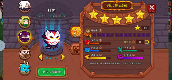 忍者的特性是速度和闪避天赋点额外+1,而9闪初始给27%闪避,结合build加点里面的忍雾+30%闪避和游戏里面一些红装,凑个七八十闪甚至百闪也不是问题(没有测试过能不能叠到百闪)。对于这种后期动辄高伤弹幕糊脸的游戏来说,高闪就意味着天然优势。+1天赋点意味着忍者可以比别人更轻松地点出9闪。