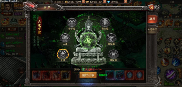 当冥界开放后,需要先打破冥界封锁结界才可以通过“冥界之门”进入冥界。打破材料为“六道精华”,可通过“六道磐涅”副本击杀BOSS掉落。