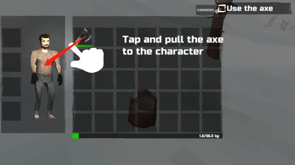 1、启动游戏后拾取斧头并装备,用以砍伐树木收集木材资源。