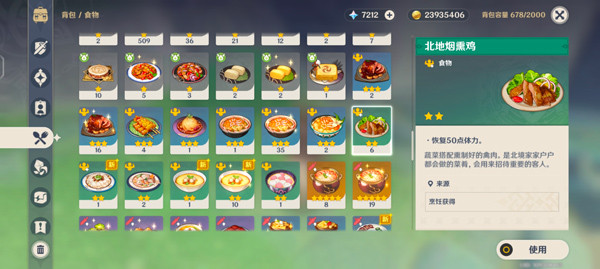 6、还有体力恢复,我们可以用道具来恢复体力,其中一个道具就是北地烟熏鸡,前期就可以得到菜谱,而所需的材料也都可以在商店买到,比较缺体力的时候就可以制作使用。