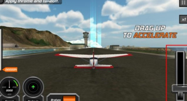 4、我们需要先将左边的滑竿往上推保持不懂,飞机就会一直前进,然后我们在将右边滑竿往下推就可以实现起飞了。