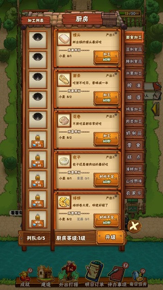 简单的玩法了解后,接着就是制作农产品啦!点击“厨房”,这里可以看到加工的农产品列表,不同的加工产品,消耗的原材料不等,如加工馒头,会消耗小麦1,面条消耗小麦2,画卷同样消耗小麦2,包子除了要消耗小麦1外,还需要青菜1,所以要想加工更多的产品,原材料的收集也是必不可少的因素。
