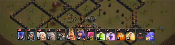 石法与狗球结合,配合蓝胖援军和女王轻松突破重要防御建筑。