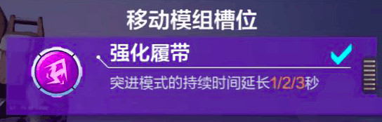 机甲5级时得到,能让突击模式时间延长,末日的核心模组之二。因为末日这个机身实在有点笨重,机动性不好就容易在敌人多或者平地上原地爆炸,这时候火力全开就显得十分重要了,加速跑路在平原上十分实用,或者混战加速漂移去偷袭敌人也行,加速的同时武器处于火力全开状态,能对敌人起到较强的压制作用。