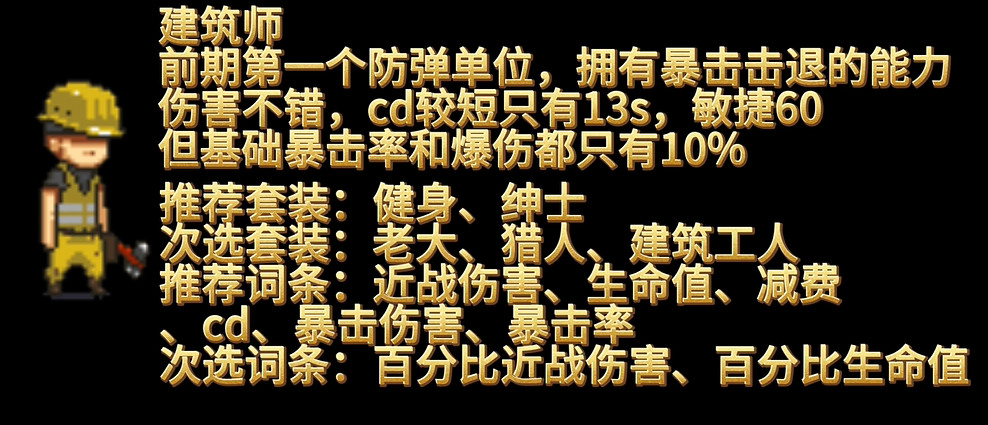 建筑师:配备防弹衣,是前期唯一的防弹单位,打第三大关推荐使用