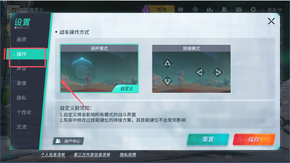 3、第三步调整操作方式,在“操作”设置里选择“战车操作方式”,这是最重要的控制设置,摇杆模式适合大部分手游玩家,按键模式则提供另一种操作体验。