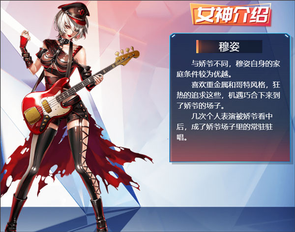 与娇爷不同,穆姿自身的家庭条件较为优越。喜欢重金属和哥特风格,狂热的追求这些,机遇巧合下来到了娇爷的场子。几次个人表演被娇爷看中后,成了娇爷场子里的常驻驻唱