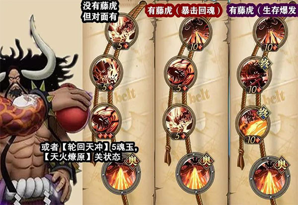 如果自己没有藤虎,怕对面有藤虎的,那就用第一套玩5+5+3。这里5魂玉技能建议用能增怒的那个,能够一定程度上保证队友的有机会一回合搞出来个奥义,只是有机会,因为这个技能只提供15点怒气,翻倍也才30点。你5魂玉技能,被对面藤虎变6魂玉,还是会差10怒气。