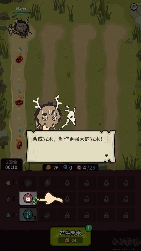 3、三个相同咒术可合体升级、变成更强大的咒术、增强战斗能力;