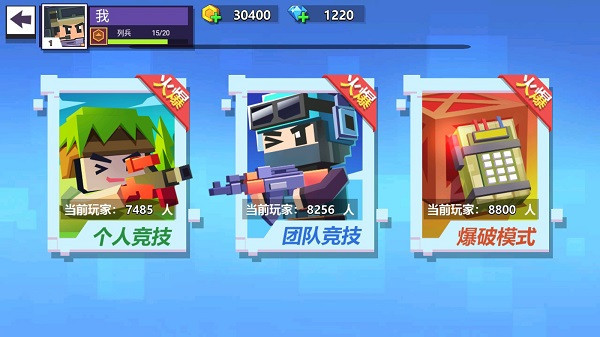 进入游戏后点击“竞技模式”,可选择个人、团队或爆破,多人在线实时匹配对战。