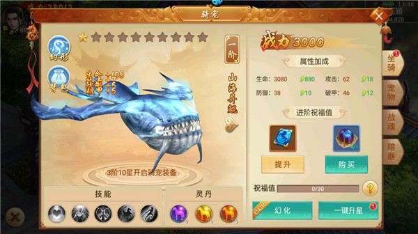坐骑能提升移动速度和属性,升级骑术需要灵草和御兽元魂