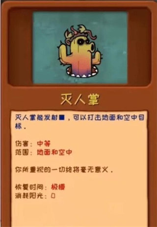 3、灭人掌:发射,打击地面和空中目标,伤害中等,恢复时间极慢,消耗阳光为0。