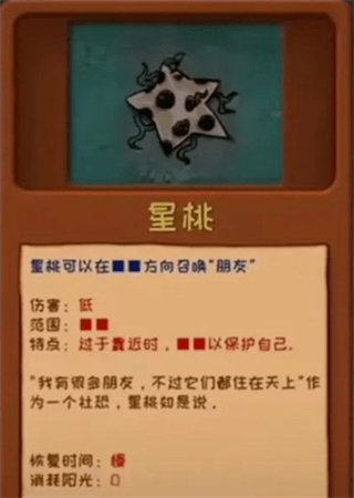 5、星桃:在方向召唤“朋友”,伤害低,范围广,特点过于近时保护自己。恢复时间未知,消耗阳光为0。