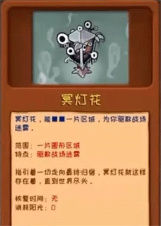 2、冥灯花:一片区战场驱雾,存在到世界尽头,恢复时间无,消耗阳光为0。