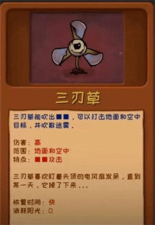4、三刃草:吹出迷雾,打击地面和空中目标,伤害高,恢复时间快,消耗阳光为0。