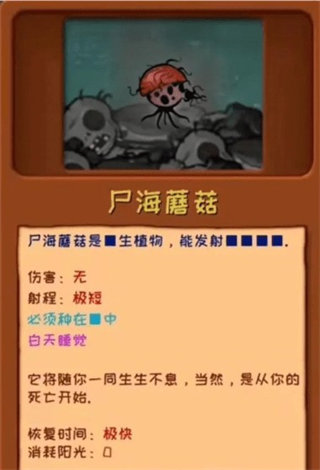 1、尸海蘑菇:生植物,无伤害,极短射程,必须种在墓碑中。白天睡觉,随你生生不息,从你的死亡开始恢复,恢复时间极快,消耗阳光为0。