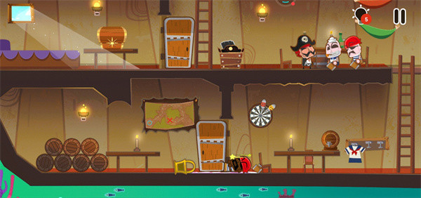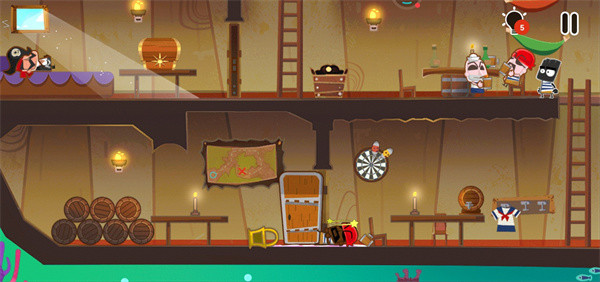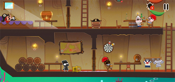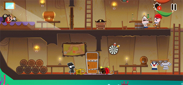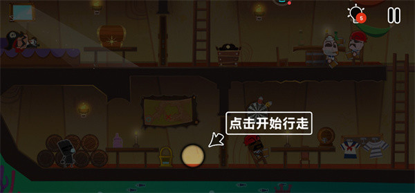 10、这时要注意,甲板上有一个海盗在巡逻,我们必须在海盗背对我们的时候迅速登上甲板;登上甲板后点击左边的滑轮跳到汽艇上就通关了。