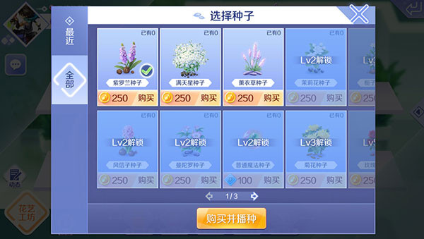 在花园购买鲜花种子,需满足等级条件,并根据花盆数量选择种子。