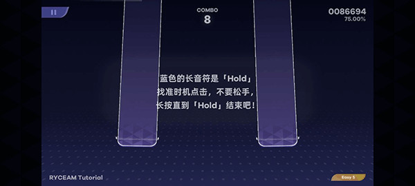 玩家需要在「HOLD」到达判定线时用手指长按相应时间。