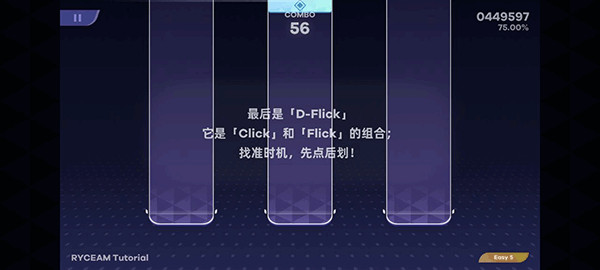 最后就稍微有一点操作的【D-flick】了,它是由【click】+【flick】结合出来的音符,我们需要先点击蓝色音符,最后滑动,在这有个坑,大家可以看见2个音符中间是有个线衔接的对吧,其实这个线没啥用处,大家就当做正常的【click】+【flick】先后出现就可以了。