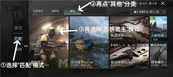 4、选择“匹配”模式,再点“其他”分类,再选择“地铁逃生”模式,点击即可进入,战栗深邃,地铁逃生。