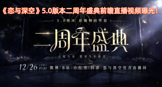 《恋与深空》官方今日宣布5.0版本二周年盛典将于下周12月31日正式上线!官方将前瞻特别节目定档于12月26日19:30,并于微博、B站、抖音、小红书等平台同步直播。有兴趣的玩家们千万不要错过这一次的精彩前瞻直播!