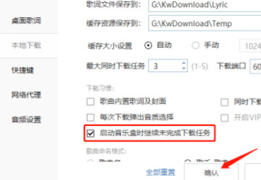 然后找到右侧中的"启动音乐盒时继续未完成下载任务",将其勾选上,最后点击确认保存即可。