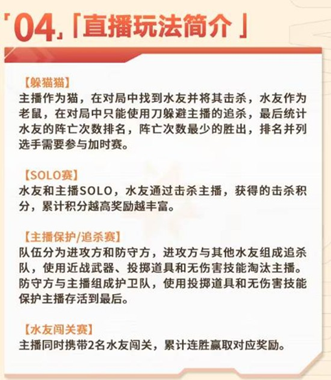 躲猫猫:主播当“猫”持刀追杀,水友只能用匕首躲藏,阵亡最少者胜;并列加赛。