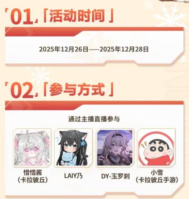 《卡拉彼丘》官方今日宣布将于12月26日至28日连续三天精彩开播!官方将一同携手六大主播,将冬日战场直接搬进直播间。以下是小编为大家准备的详细活动内容资讯,有兴趣的玩家们快来一起边看边玩边领奖,不容错过精彩的福利!