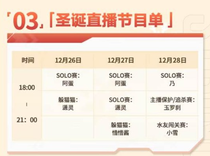 12/27 18:00 SOLO赛(潇灵)→21:00躲猫猫(惜惜酱)+水友闯关赛(小雪)。