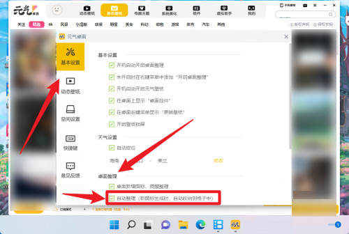 进入新界面后,点击左侧中的"基本设置"选项,找到右侧"桌面整理"中的"自动整理",将其勾选上就可以了。