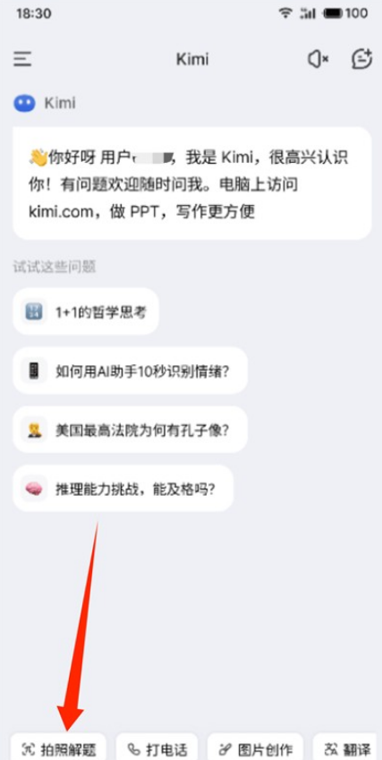 打开kimi智能助手APP,进入后点击界面下方的【拍照解题】按钮。