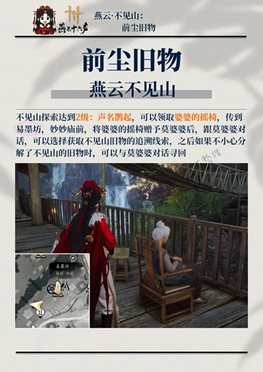 不见山探索达到2级:声名鹊起,可以领取婆婆的摇椅,传到易墨坊,妙妙庙前,将婆婆的摇椅赠予莫婆婆后,跟莫婆婆对话,可以选择获取不见山旧物的追溯线索