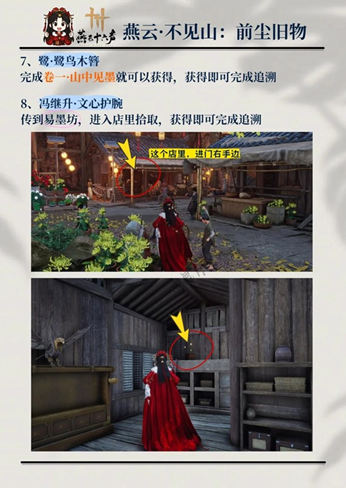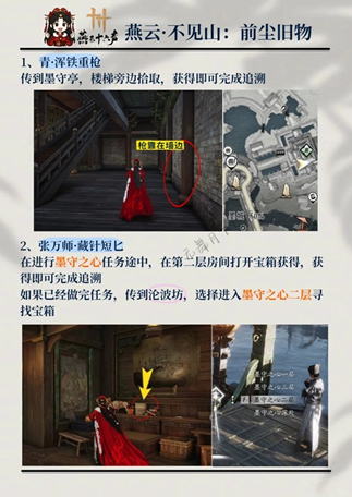 传到墨守亭,楼梯旁边拾取,获得即可完成追溯,枪靠在墙边