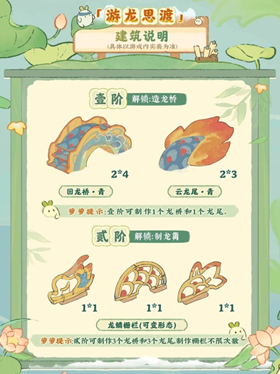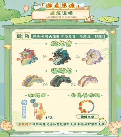 该建筑不仅能拼接长龙,还能用「龙鳞栅栏」和「寄思鲤灯」装点长龙,为龙首和龙身绘染不同配色 ,更有专属头像框、专属龙灯跟随特效和鲤灯彩蛋手持物期待大家探索!