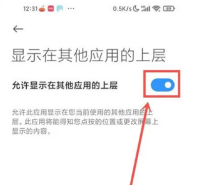打开【允许显示在其他应用上层】的开关,完成设置。