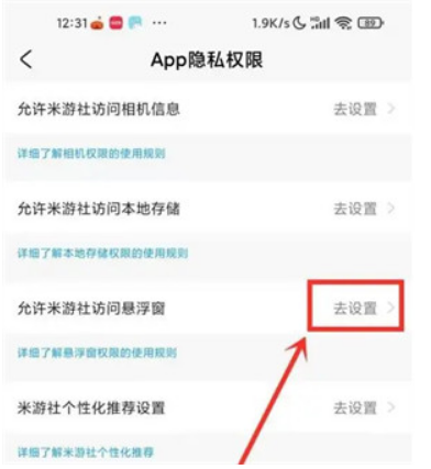 找到【允许米游社访问悬浮窗】,点击右侧的【去设置】按钮。