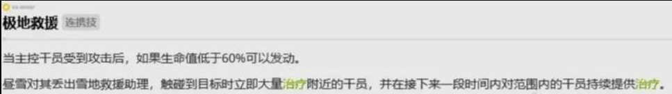 昼雪的连携技是主控干员生命值低于60%可以发动,冷却时间25秒。按E即可回血,操作极其简单。