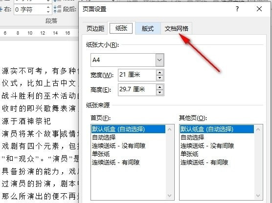 打开图标之后,我们进入页面设置弹框页面,在该页面中我们找到“文档网格”选项,点击打开该选项