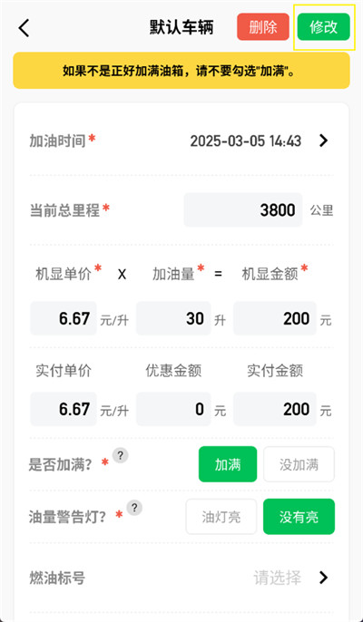 2、进入加油详情界面后,点击想要修改的数据,点击数据后方的修改按键。