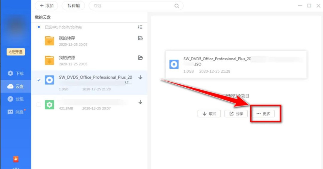 4、选中文件后,将视线移至界面右侧窗口,在这里能够看到一个“更多”按钮,点击该按钮,会弹出一个下拉菜单,菜单中包含了对文件进行各种操作的选项。