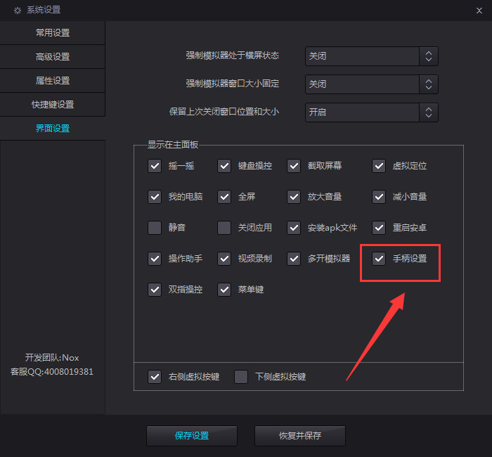 3、进入新界面后,点击左侧中的"界面设置",将右侧中的"手柄设置"勾选上即可在功能栏列表中查看到了。