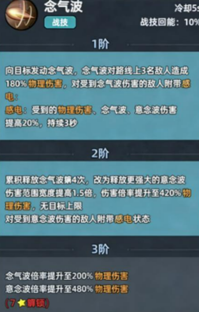 2.其战技“念气波”是整套输出循环的启动键。该技能为直线型攻击,对路径上最多3名敌人造成180%物理伤害,并在命中目标时施加“感电”状态。该状态本身不造成伤害,但至关重要:当处于感电状态的目标再次被“念气波”或“蓄念波”击中时,将额外承受20%伤害,持续3秒。因此,每场战斗起手必须优先使用该技能完成感电挂载,后续所有伤害才能进入增益区间。